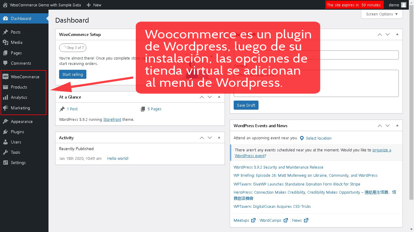 Note que al ingresar se accede al admin de Wordpress y como el plugin de tienda virtual crea en el menú los accesos a Woocomerce - Products - Analitycs - Marketing