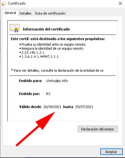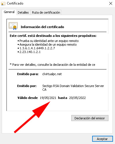 Se instaló el certificado de 9.48 dólares el año en el hosting de GoDaddy con dominio clvirtualpc.net, observe el tiempo de validación de 1 año